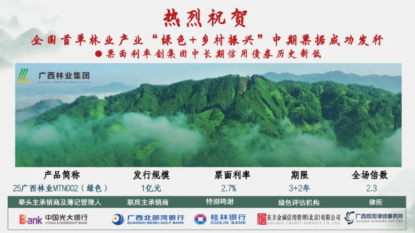 2025年8月4日,廣林集團成功發(fā)行全國首單林業(yè)產(chǎn)業(yè)“綠色+鄉(xiāng)村振興”中期票據(jù),債券發(fā)行規(guī)模1億元,期限3+2年,票面利率2.7%,創(chuàng)公司中長期債券發(fā)行利率歷史新低,為廣西林業(yè)綠色高質(zhì)量發(fā)展提供資金支撐開辟新渠道,添加新動能。